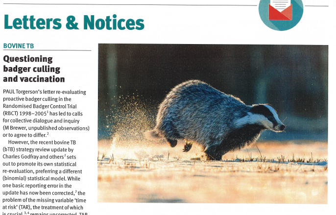 A letter published 13th December in Vet Record (here) raised questions concerning the continuation of badger blame following criticisms of the recent Godfray review. A response from the Godfray review panel was published alongside, repeating their view that “reasonable people can disagree about the best way to analyse complex data“. They remain, however, like Defra, unwilling to enter into a discussion on any of the analyses.